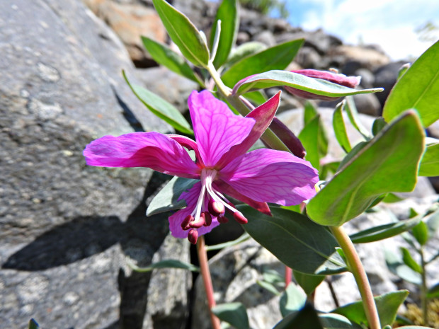 Chamaenerion latifolium (formerly Epilobium latifolium, also called Chamerion latifolium[1][2]) is a species of flowering plant in the evening primrose family known by the English common names dwarf fireweed[3] and river beauty willowherb. It has a circumboreal distribution, appearing throughout the northern regions of the Northern Hemisphere, including subarctic and Arctic areas such as snowmelt-flooded gravel bars and talus, in a wide range of elevations.[4] This is a perennial herb growing in clumps of leaves variable in size, shape, and texture above a woody caudex. The leaves are 1 to 10 centimeters long, lance-shaped to oval, pointed or rounded at the tips, and hairy to hairless and waxy. The inflorescence is a rough-haired raceme of nodding flowers with bright to deep pink, and occasionally white, petals up to 3 centimeters long. Behind the opened petals are pointed sepals. The fruit is an elongated capsule which may exceed 10 centimeters in length.